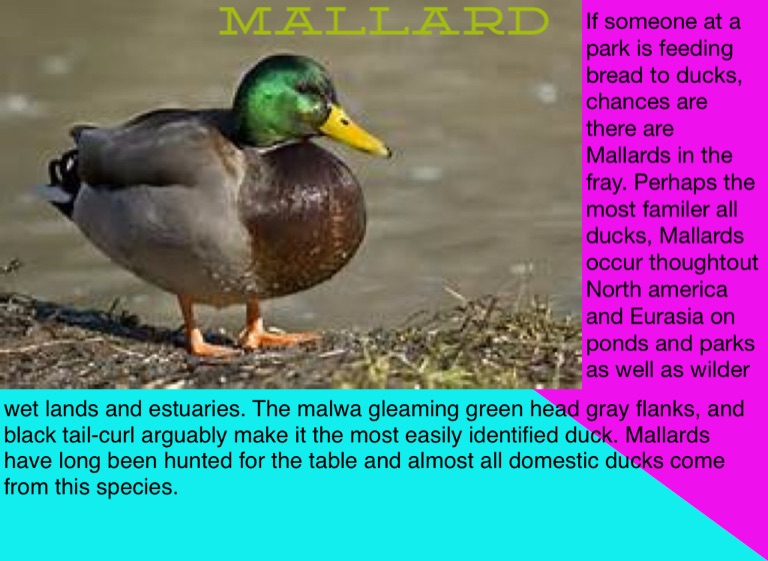 If someone at a park is feeding bread to ducks, chances are there are Mallards in the fray. Perhaps the most familer all ducks, Mallards occur thoughtout North america and Eurasia on ponds and parks as well as wilder