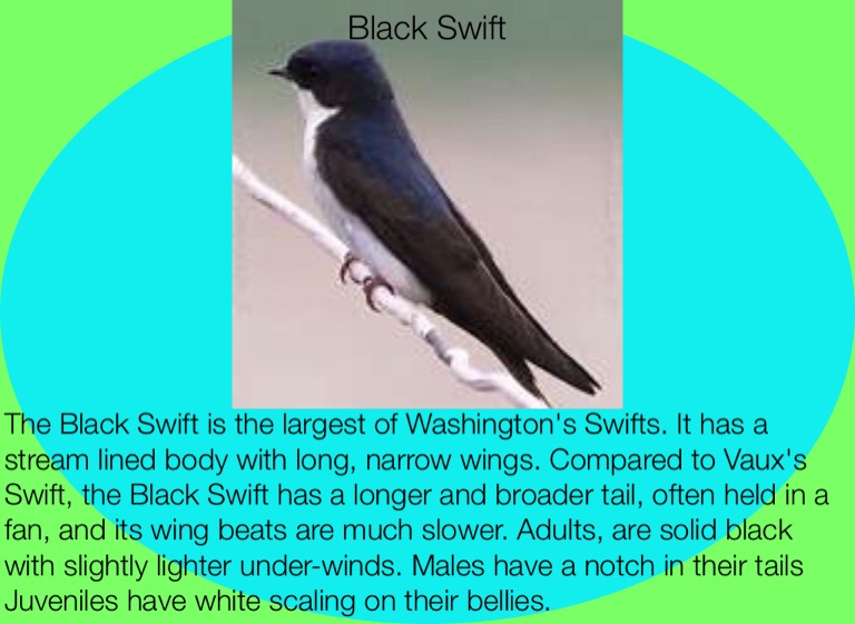The Black Swift is the largest of Washington's Swifts. It has a stream lined body with long, narrow wings. Compared to Vaux's Swift, the Black Swift has a longer and broader tail, often held in a fan, and its wing beats are much slower. Adults, are solid black with slightly lighter under-winds. Males have a notch in their tails Juveniles have white scaling on their bellies.