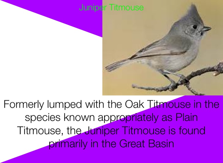 Formerly lumped with the Oak Titmouse in the species known appropriately as Plain Titmouse, the Juniper Titmouse is found primarily in the Great Basin