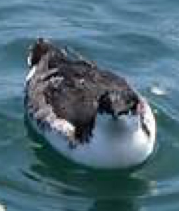 The Robin-sized, but slender, resebling a tiny murre. Black above, with no distinctive pattern; white cheeks, throat, and underpants. Underwing converts white, bill thin and narrow. No seasonal change in plumage.