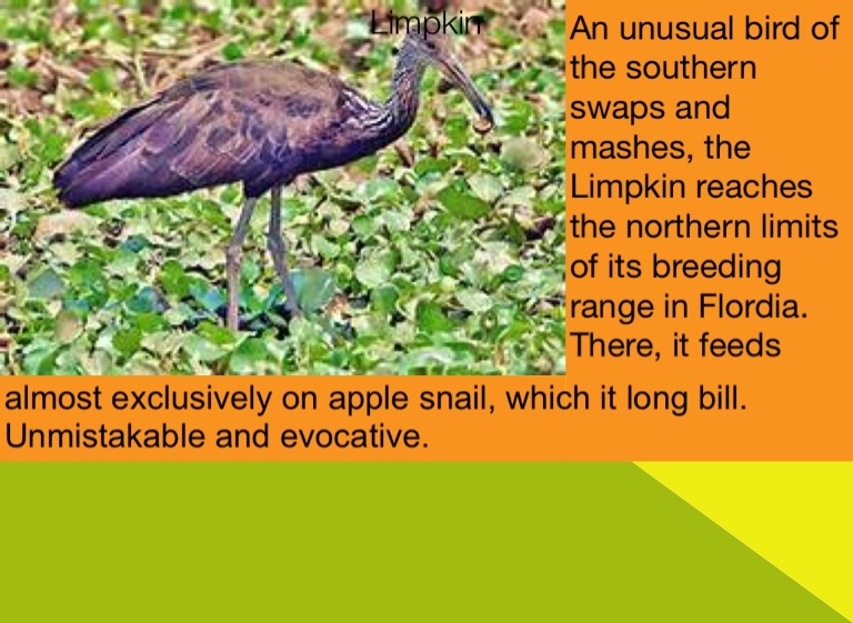 An unusual bird of the southern swaps and mashes, the Limpkin reaches the northern limits of its breeding range in Flordia. There, it feeds