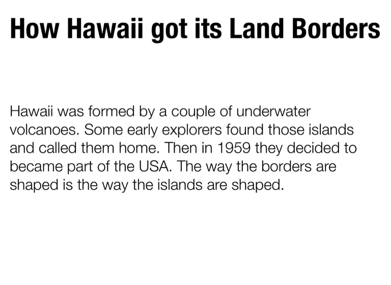 Hawaii was formed by a couple of underwater volcanoes. Some early explorers found those islands and called them home. Then in 1959 they decided to became part of the USA. The way the borders are shaped is the way the islands are shaped.