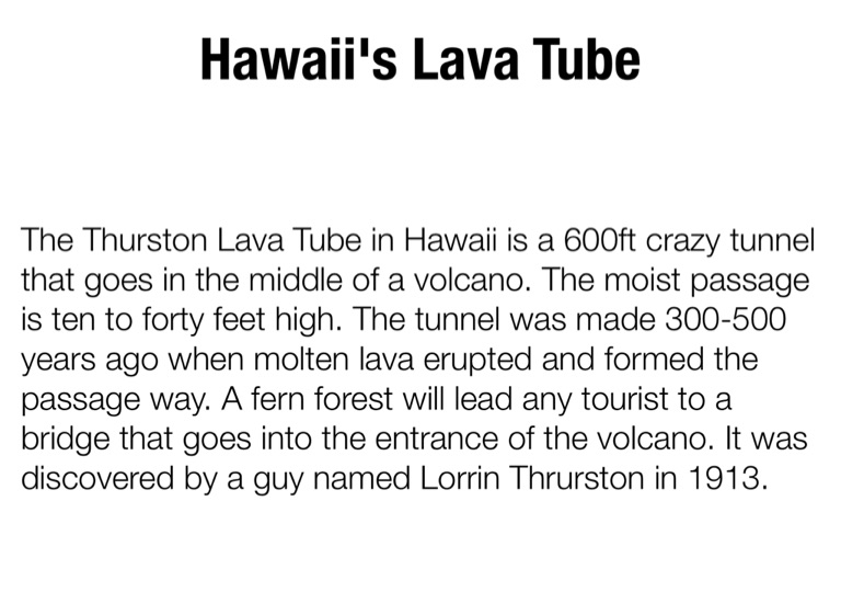 The Thurston Lava Tube in Hawaii is a 600ft crazy tunnel that goes in the middle of a volcano. The moist passage is ten to forty feet high. The tunnel was made 300-500 years ago when molten lava erupted and formed the passage way. A fern forest will lead any tourist to a bridge that goes into the entrance of the volcano. It was discovered by a guy named Lorrin Thrurston in 1913.
