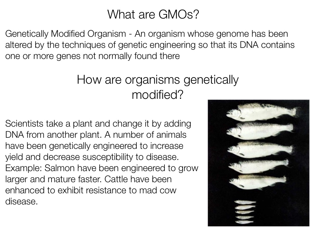 Example: Salmon have been engineered to grow larger and mature faster. Cattle have been enhanced to exhibit resistance to mad cow disease.