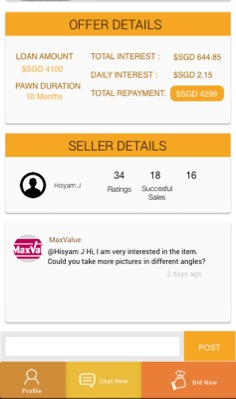 After viewing an item, pawn shops can also bid for the item, chat with the seller about the item or view the seller information.