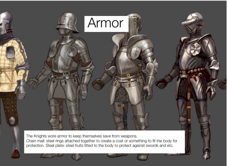 Chain mail: steel rings attached together to create a coat or something to fit the body for protection. Steel plate: steel fruits fitted to the body to protect against swords and etc.