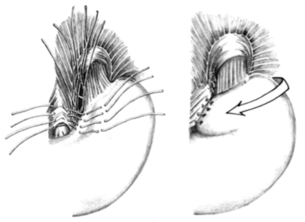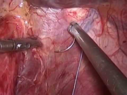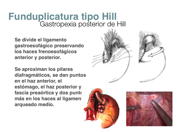 Se aproximan los pilares diafragmáticos, se dan puntos en el haz anterior, el estómago, el haz posterior y la fascia preaórtica y dos puntos más en los haces al ligamento arqueado medio.