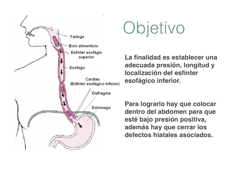 Para lograrlo hay que colocar dentro del abdomen para que esté bajo presión positiva, además hay que cerrar los defectos hiatales asociados.