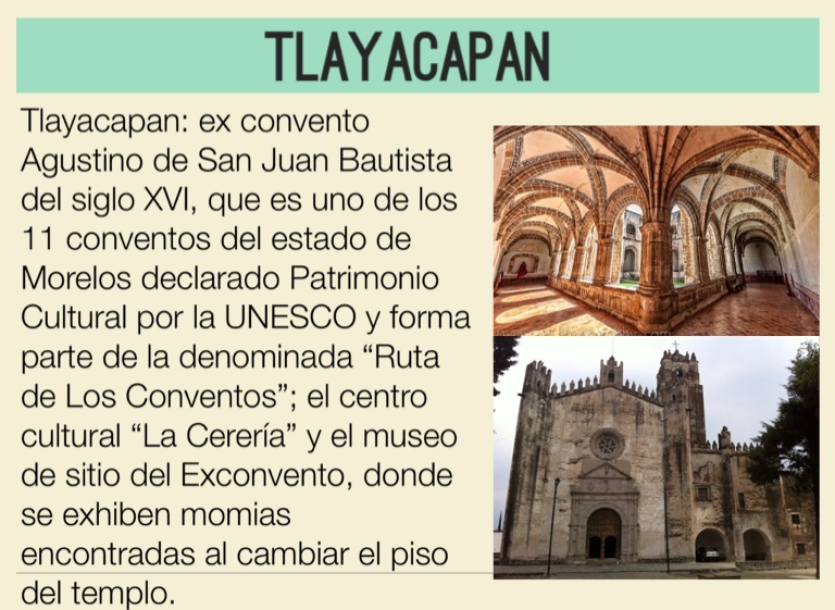 Tlayacapan: ex convento Agustino de San Juan Bautista del siglo XVI, que es uno de los 11 conventos del estado de Morelos declarado Patrimonio Cultural por la UNESCO y forma parte de la denominada “Ruta de Los Conventos”; el centro cultural “La Cerería” y el museo de sitio del Exconvento, donde se exhiben momias encontradas al cambiar el piso del templo.