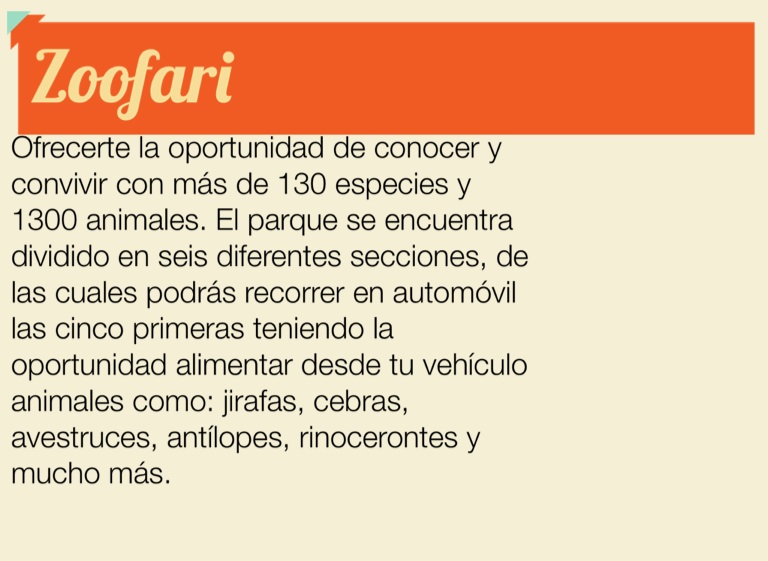 Ofrecerte la oportunidad de conocer y convivir con más de 130 especies y 1300 animales. El parque se encuentra dividido en seis diferentes secciones, de las cuales podrás recorrer en automóvil las cinco primeras teniendo la oportunidad alimentar desde tu vehículo animales como: jirafas, cebras, avestruces, antílopes, rinocerontes y mucho más.