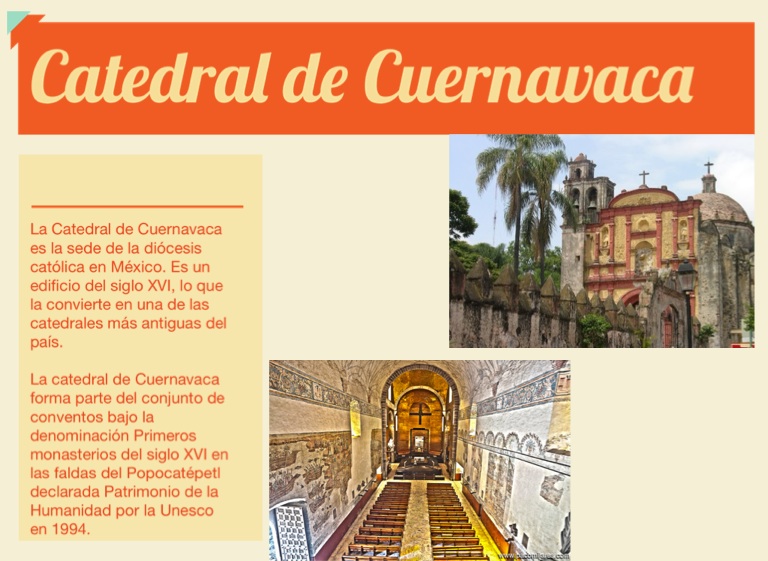 La catedral de Cuernavaca forma parte del conjunto de conventos bajo la denominación Primeros monasterios del siglo XVI en las faldas del Popocatépetl declarada Patrimonio de la Humanidad por la Unesco en 1994.
