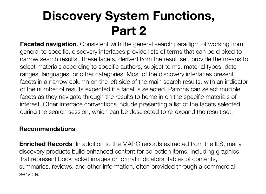 Enriched Records: In addition to the MARC records extracted from the ILS, many discovery products build enhanced content for collection items, including graphics that represent book jacket images or format indicators, tables of contents, summaries, reviews, and other information, often provided through a commercial service.