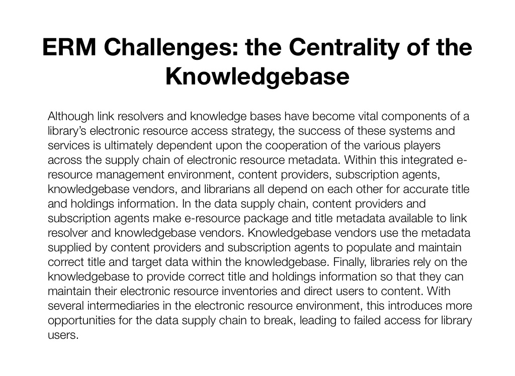 Although link resolvers and knowledge bases have become vital components of a library’s electronic resource access strategy, the success of these systems and services is ultimately dependent upon the cooperation of the various players across the supply chain of electronic resource metadata. Within this integrated e-resource management environment, content providers, subscription agents, knowledgebase vendors, and librarians all depend on each other for accurate title and holdings information. In the data supply chain, content providers and subscription agents make e-resource package and title metadata available to link resolver and knowledgebase vendors. Knowledgebase vendors use the metadata supplied by content providers and subscription agents to populate and maintain correct title and target data within the knowledgebase. Finally, libraries rely on the knowledgebase to provide correct title and holdings information so that they can maintain their electronic resource inventories and direct users to content. With several intermediaries in the electronic resource environment, this introduces more opportunities for the data supply chain to break, leading to failed access for library users.
