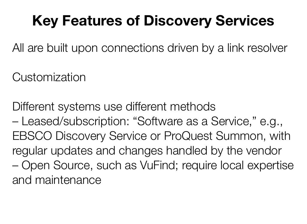 – Leased/subscription: “Software as a Service,” e.g., EBSCO Discovery Service or ProQuest Summon, with regular updates and changes handled by the vendor