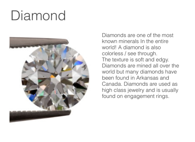 Diamonds are mined all over the world but many diamonds have been found in Arkansas and Canada. Diamonds are used as high class jewelry and is usually found on engagement rings.