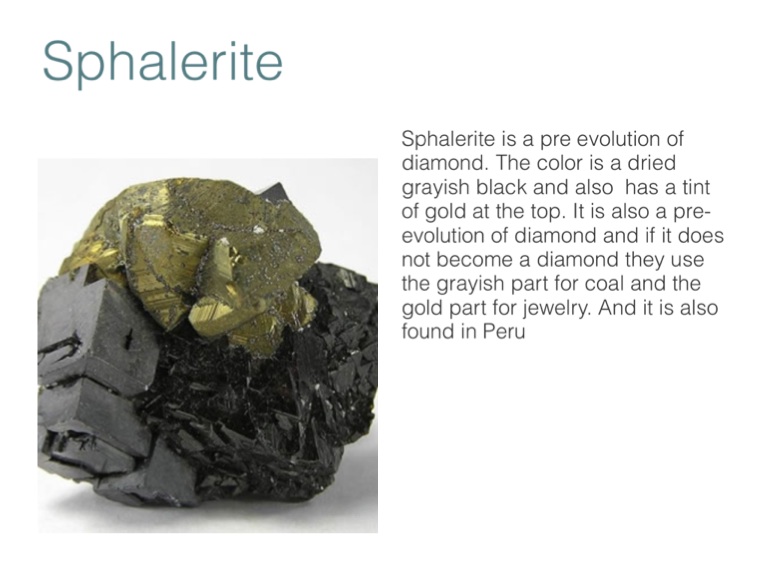 Sphalerite is a pre evolution of diamond. The color is a dried grayish black and also has a tint of gold at the top. It is also a pre-evolution of diamond and if it does not become a diamond they use the grayish part for coal and the gold part for jewelry. And it is also found in Peru