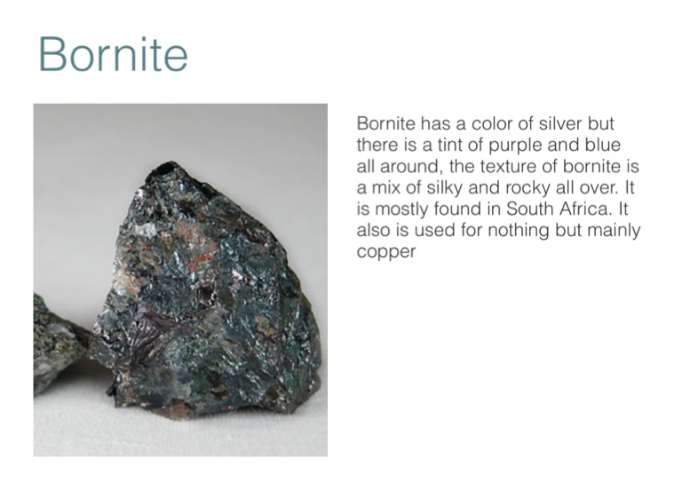 Bornite has a color of silver but there is a tint of purple and blue all around, the texture of bornite is a mix of silky and rocky all over. It is mostly found in South Africa. It also is used for nothing but mainly copper