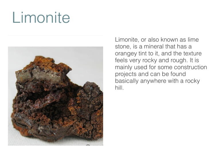 Limonite, or also known as lime stone, is a mineral that has a orangey tint to it, and the texture feels very rocky and rough. It is mainly used for some construction projects and can be found basically anywhere with a rocky hill.