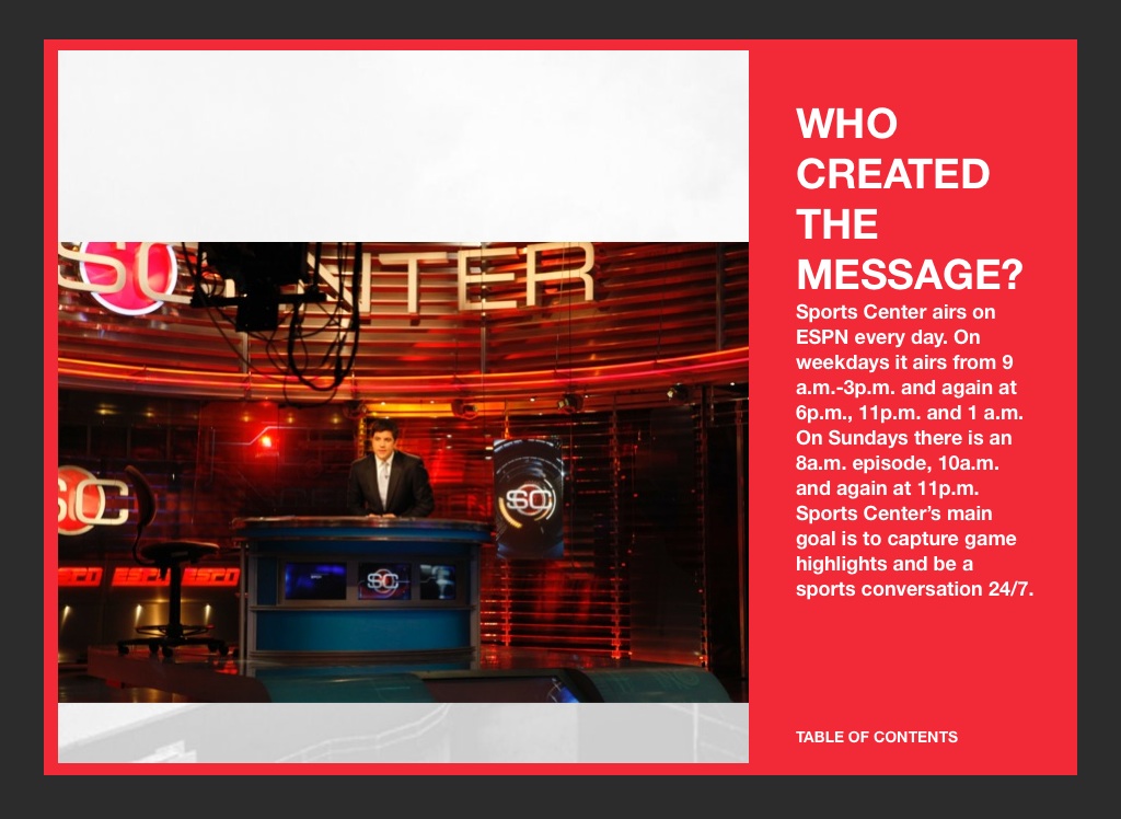 Sports Center airs on ESPN every day. On weekdays it airs from 9 a.m.-3p.m. and again at 6p.m., 11p.m. and 1 a.m. On Sundays there is an 8a.m. episode, 10a.m. and again at 11p.m. Sports Center’s main goal is to capture game highlights and be a sports conversation 24/7.