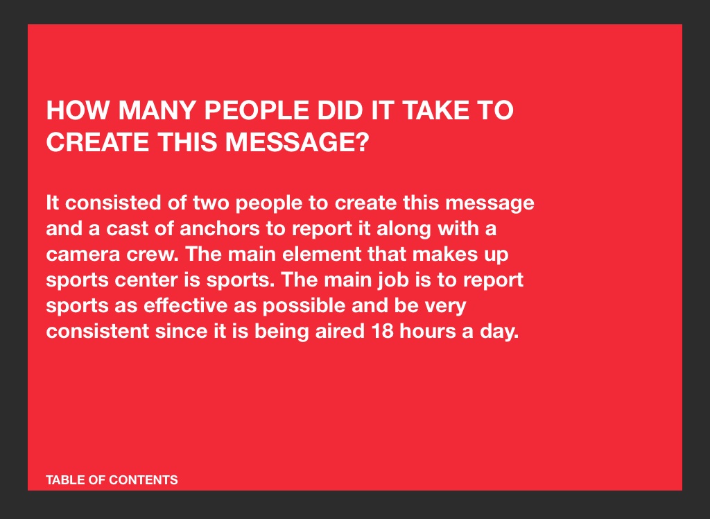 It consisted of two people to create this message and a cast of anchors to report it along with a camera crew. The main element that makes up sports center is sports. The main job is to report sports as effective as possible and be very consistent since it is being aired 18 hours a day.