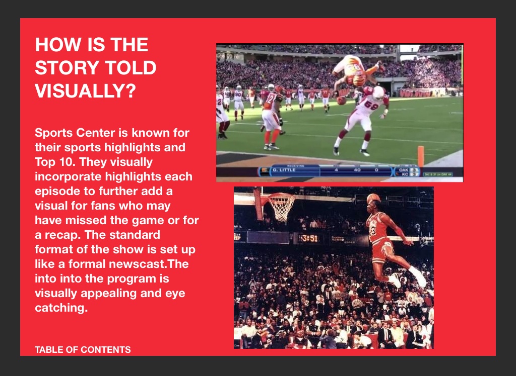 Sports Center is known for their sports highlights and Top 10. They visually incorporate highlights each episode to further add a visual for fans who may have missed the game or for a recap. The standard format of the show is set up like a formal newscast.The into into the program is visually appealing and eye catching.