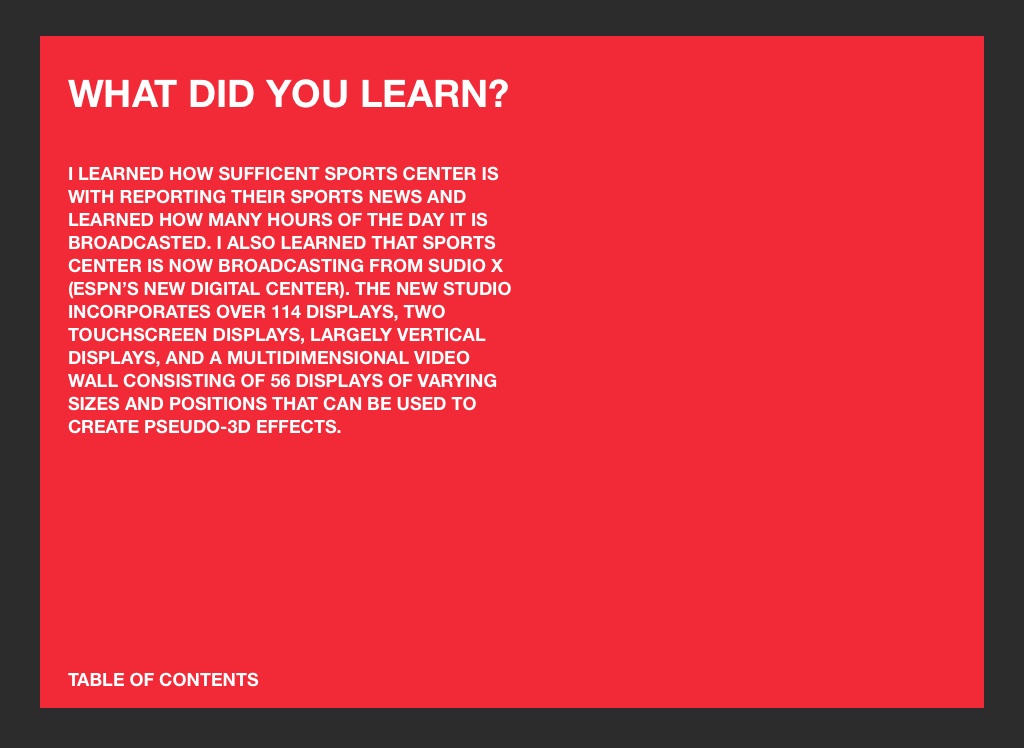 I LEARNED HOW SUFFICENT SPORTS CENTER IS WITH REPORTING THEIR SPORTS NEWS AND LEARNED HOW MANY HOURS OF THE DAY IT IS BROADCASTED. I ALSO LEARNED THAT SPORTS CENTER IS NOW BROADCASTING FROM SUDIO X (ESPN’S NEW DIGITAL CENTER). THE NEW STUDIO INCORPORATES OVER 114 DISPLAYS, TWO TOUCHSCREEN DISPLAYS, LARGELY VERTICAL DISPLAYS, AND A MULTIDIMENSIONAL VIDEO WALL CONSISTING OF 56 DISPLAYS OF VARYING SIZES AND POSITIONS THAT CAN BE USED TO CREATE PSEUDO-3D EFFECTS.
