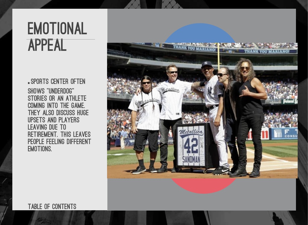 .sports center often shows “underdog” stories or an athlete coming into the game. they also discuss huge upsets and players leaving due to retirement. this leaves people feeling different emotions.