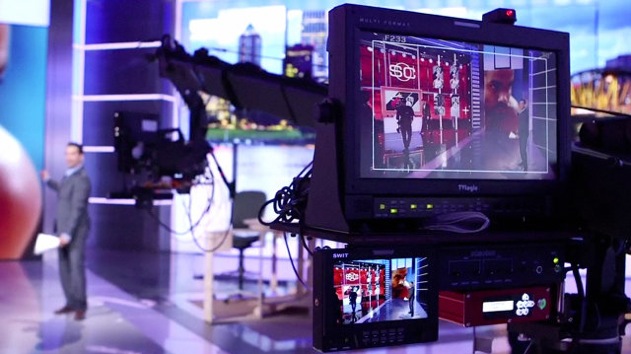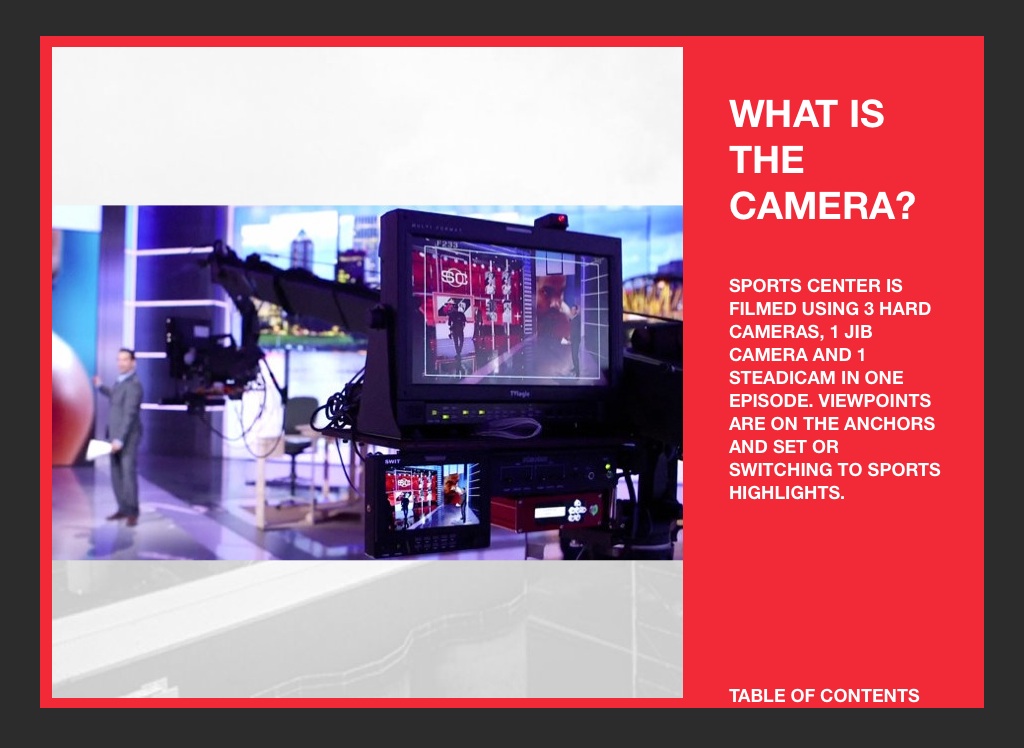 SPORTS CENTER IS FILMED USING 3 HARD CAMERAS, 1 JIB CAMERA AND 1 STEADICAM IN ONE EPISODE. VIEWPOINTS ARE ON THE ANCHORS AND SET OR SWITCHING TO SPORTS HIGHLIGHTS.