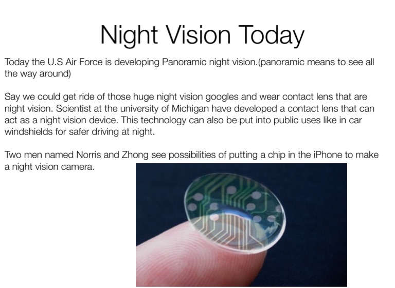 Say we could get ride of those huge night vision googles and wear contact lens that are night vision. Scientist at the university of Michigan have developed a contact lens that can act as a night vision device. This technology can also be put into public uses like in car windshields for safer driving at night.