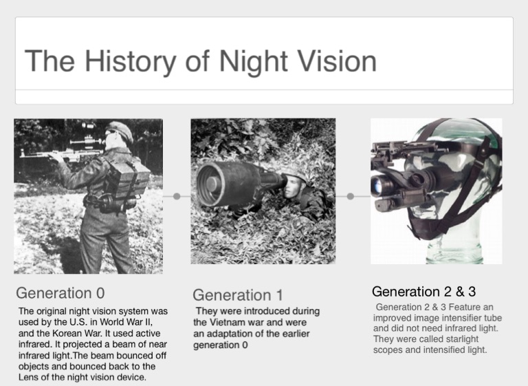 The original night vision system was used by the U.S. in World War II, and the Korean War. It used active infrared. It projected a beam of near infrared light.The beam bounced off objects and bounced back to the Lens of the night vision device.