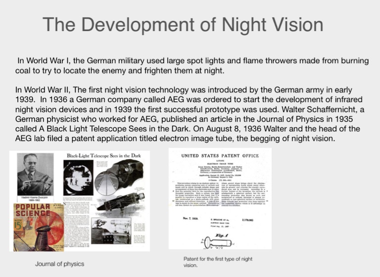 In World War II, The first night vision technology was introduced by the German army in early 1939. In 1936 a German company called AEG was ordered to start the development of infrared night vision devices and in 1939 the first successful prototype was used. Walter Schaffernicht, a German physicist who worked for AEG, published an article in the Journal of Physics in 1935 called A Black Light Telescope Sees in the Dark. On August 8, 1936 Walter and the head of the AEG lab filed a patent application titled electron image tube, the begging of night vision.