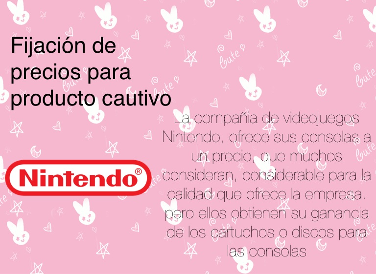 La compaƱia de videojuegos Nintendo, ofrece sus consolas a un precio, que muchos consideran, considerable para la calidad que ofrece la empresa. pero ellos obtienen su ganancia de los cartuchos o discos para las consolas