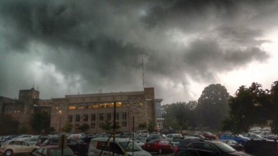 Most tornados happen when there is thunderstorms. The sky is dark grayish black with LOTS of clouds. Sometimes instead of rain there is hail.
