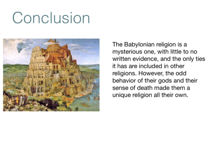 The Babylonian religion is a mysterious one, with little to no written evidence, and the only ties it has are included in other religions. However, the odd behavior of their gods and their sense of death made them a unique religion all their own.