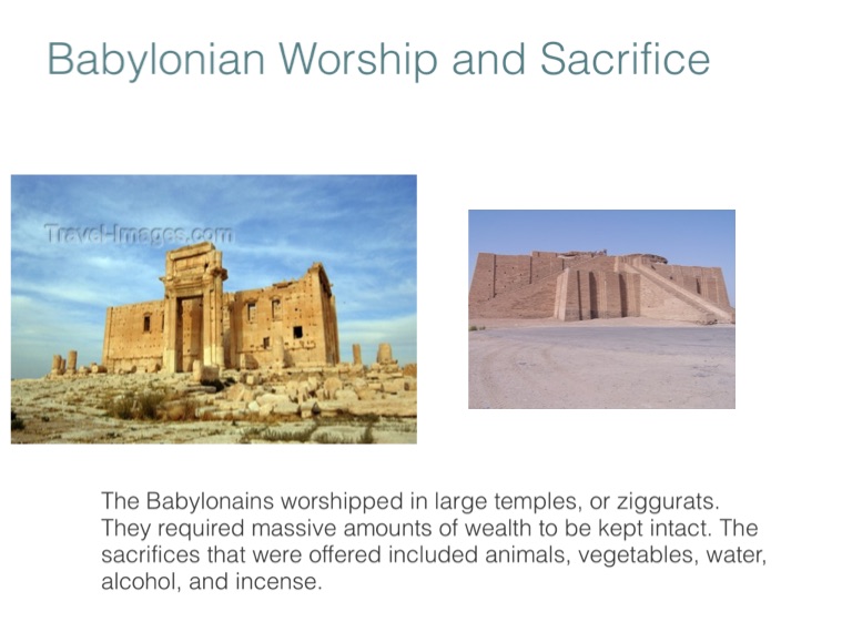 The Babylonains worshipped in large temples, or ziggurats. They required massive amounts of wealth to be kept intact. The sacrifices that were offered included animals, vegetables, water, alcohol, and incense.
