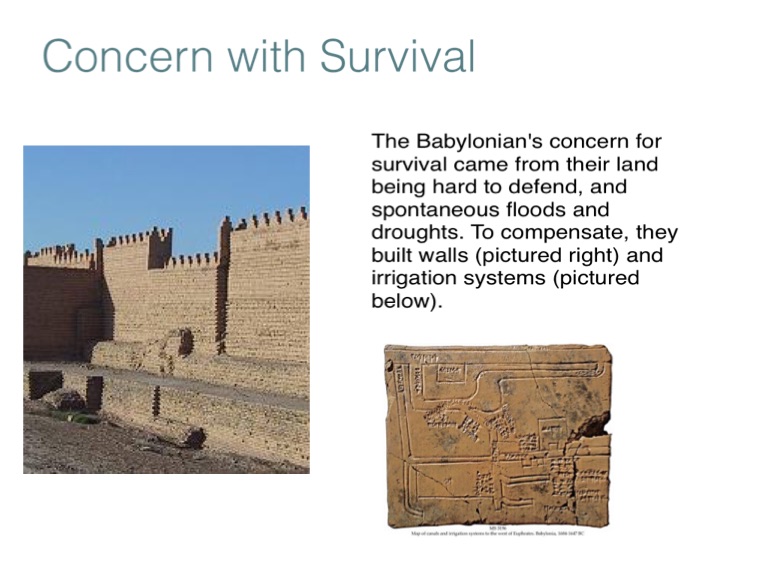 The Babylonian's concern for survival came from their land being hard to defend, and spontaneous floods and droughts. To compensate, they built walls (pictured right) and irrigation systems (pictured below).