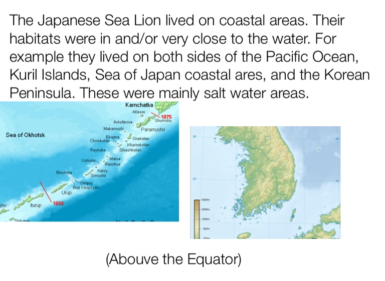 The Japanese Sea Lion lived on coastal areas. Their habitats were in and/or very close to the water. For example they lived on both sides of the Pacific Ocean, Kuril Islands, Sea of Japan coastal ares, and the Korean Peninsula. These were mainly salt water areas.