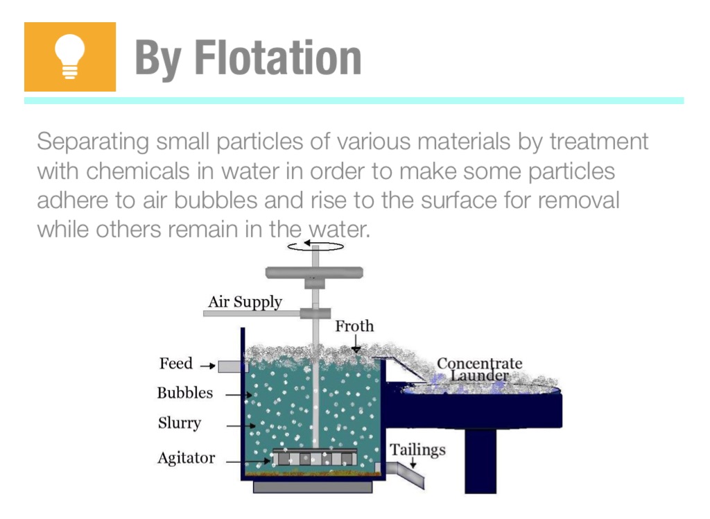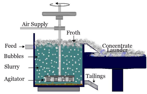 Separating small particles of various materials by treatment with chemicals in water in order to make some particles adhere to air bubbles and rise to the surface for removal while others remain in the water.