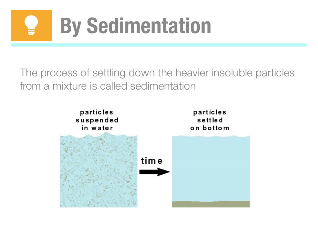 The process of settling down the heavier insoluble particles from a mixture is called sedimentation