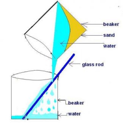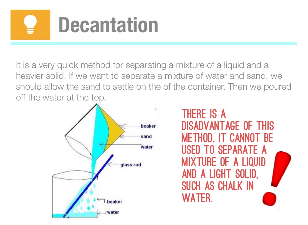 It is a very quick method for separating a mixture of a liquid and a heavier solid. If we want to separate a mixture of water and sand, we should allow the sand to settle on the of the container. Then we poured off the water at the top.