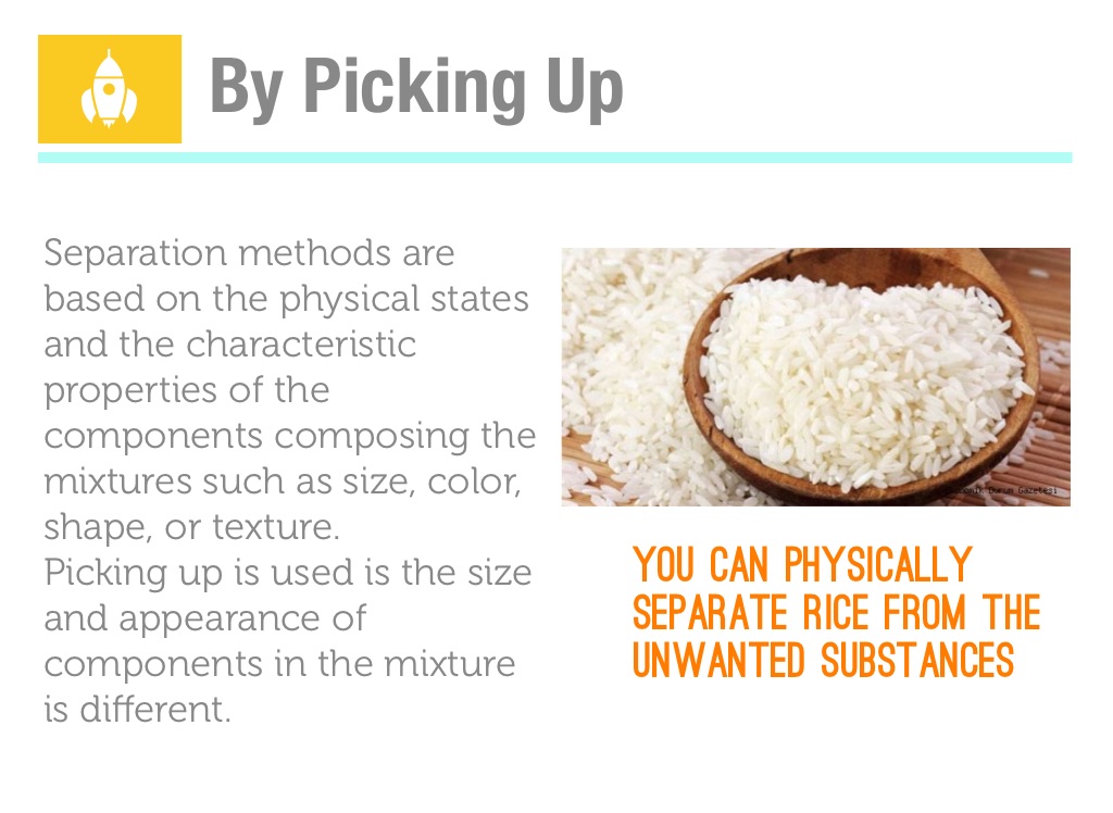 Separation methods are based on the physical states and the characteristic properties of the components composing the mixtures such as size, color, shape, or texture.