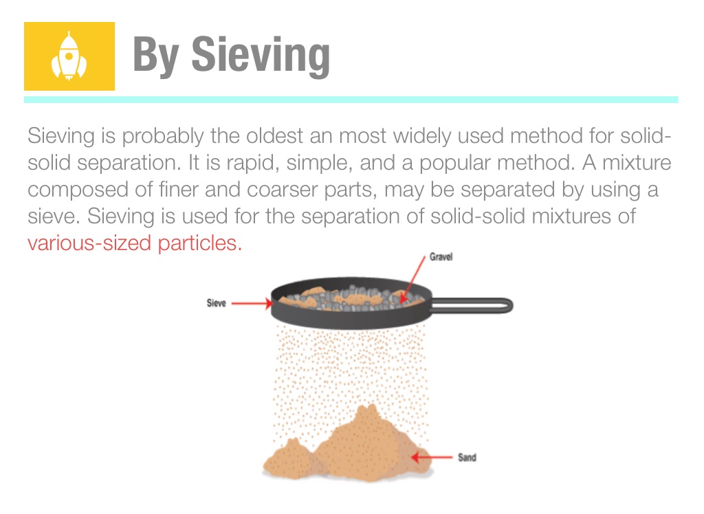 Sieving is probably the oldest an most widely used method for solid-solid separation. It is rapid, simple, and a popular method. A mixture composed of finer and coarser parts, may be separated by using a sieve. Sieving is used for the separation of solid-solid mixtures of various-sized particles.