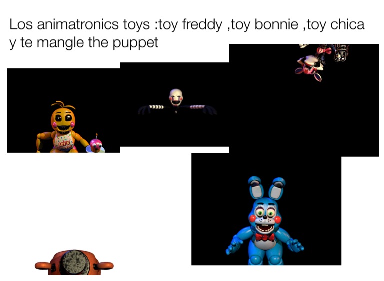 Los animatronics toys :toy freddy ,toy bonnie ,toy chica y te mangle the puppet
