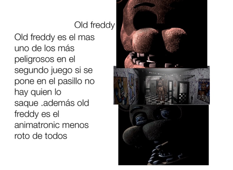 Old freddy es el mas uno de los más peligrosos en el segundo juego si se pone en el pasillo no hay quien lo saque .además old freddy es el animatronic menos roto de todos