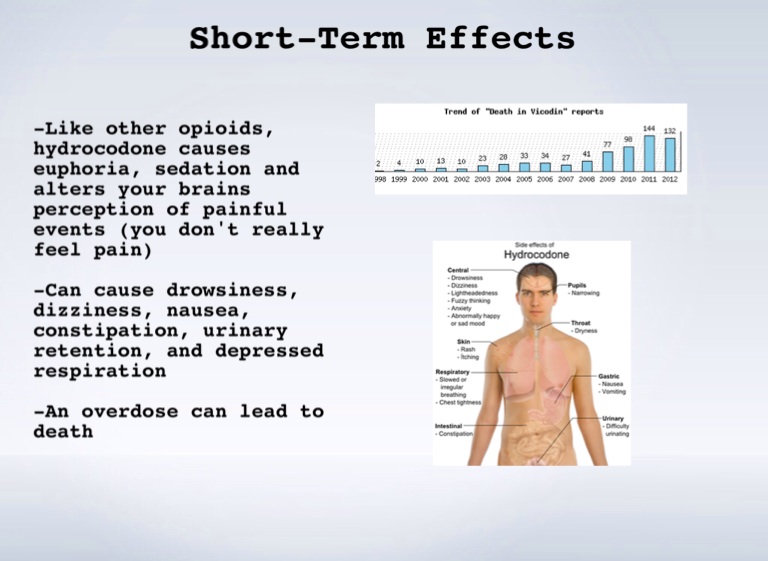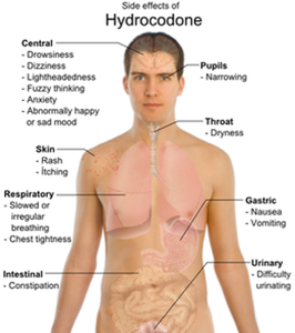 -Like other opioids, hydrocodone causes euphoria, sedation and alters your brains perception of painful events (you don't really feel pain)