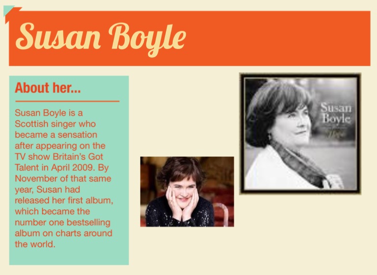 Susan Boyle is a Scottish singer who became a sensation after appearing on the TV show Britain’s Got Talent in April 2009. By November of that same year, Susan had released her first album, which became the number one bestselling album on charts around the world.