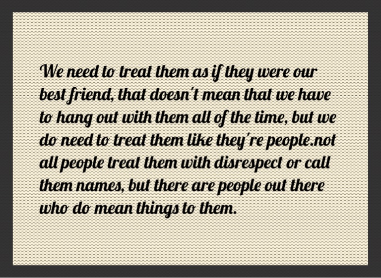 We need to treat them as if they were our best friend, that doesn't mean that we have to hang out with them all of the time, but we do need to treat them like they're people.not all people treat them with disrespect or call them names, but there are people out there who do mean things to them.