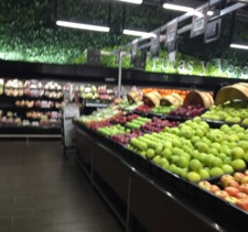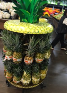 El etiquetado y la nomenclatura de los productos está ubicado en una barra transversal de aluminio, volando sobre el anaquel, usan escenografía de barriles o canastas inclinadas, lo que nos da una sensación de que las frutas están cayendo, una idea innovadora.