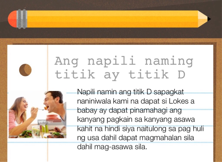 Napili namin ang titik D sapagkat naniniwala kami na dapat si Lokes a babay ay dapat pinamahagi ang kanyang pagkain sa kanyang asawa kahit na hindi siya naitulong sa pag huli ng usa dahil dapat magmahalan sila dahil mag-asawa sila.