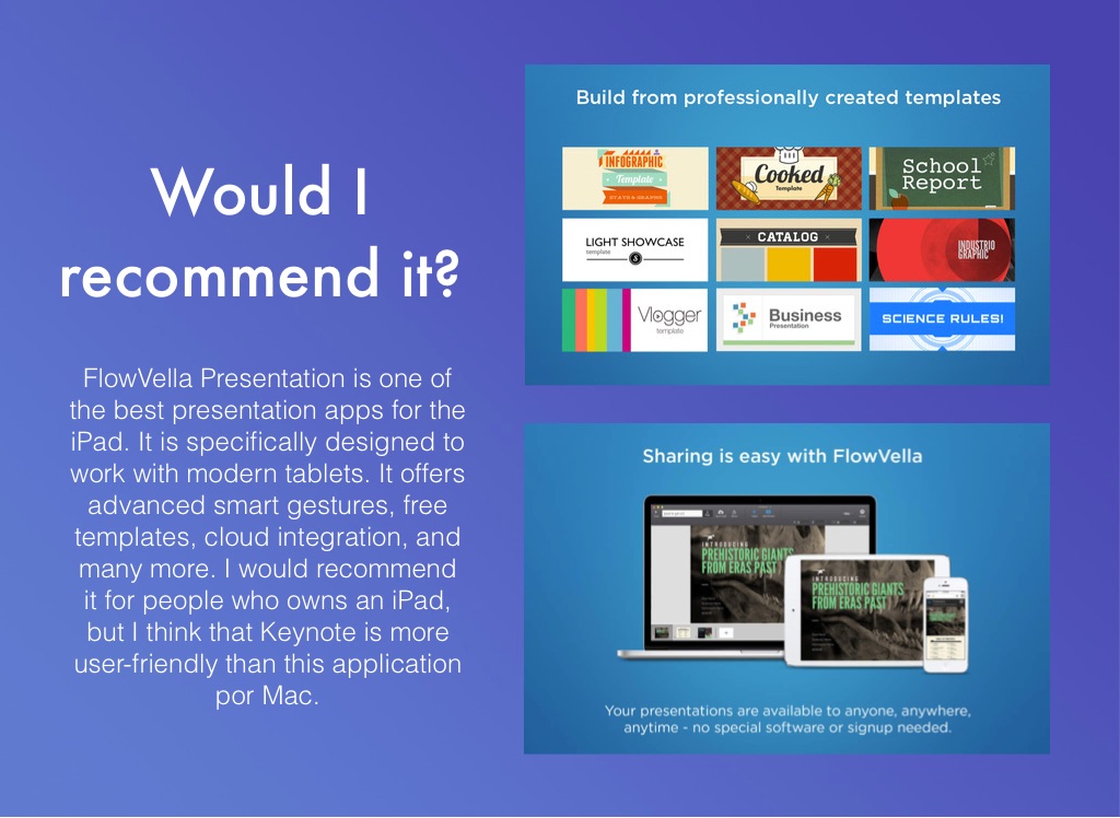 FlowVella Presentation is one of the best presentation apps for the iPad. It is specifically designed to work with modern tablets. It offers advanced smart gestures, free templates, cloud integration, and many more. I would recommend it for people who owns an iPad, but I think that Keynote is more user-friendly than this application por Mac.